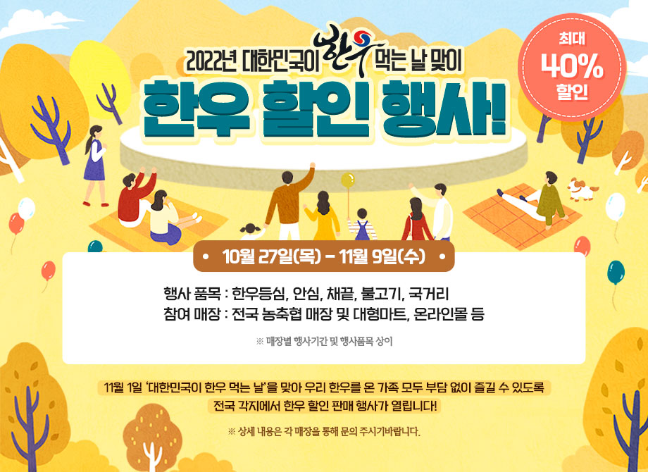 ○ 농협 행사기간 : (오프라인 매장)'22. 10.29(토) ~ 11.1.(화) (4일간) / (온라인)'22.10.27.(목)~11.9.(수) (14일간)