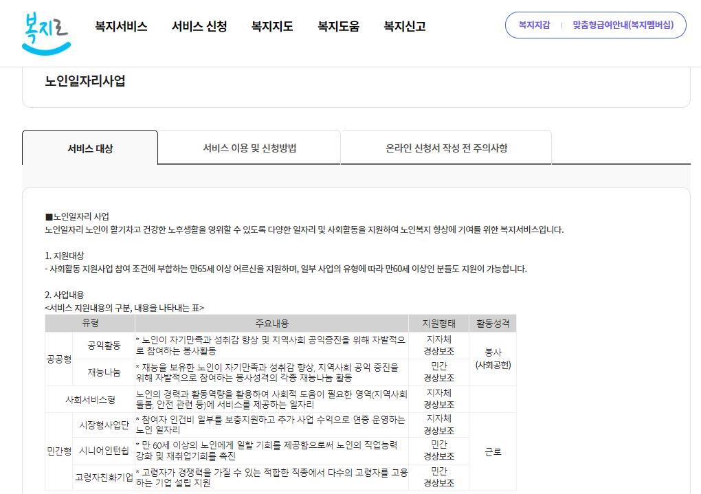 노인일자리 및 사회활동 지원사업 신청자격 홈페이지